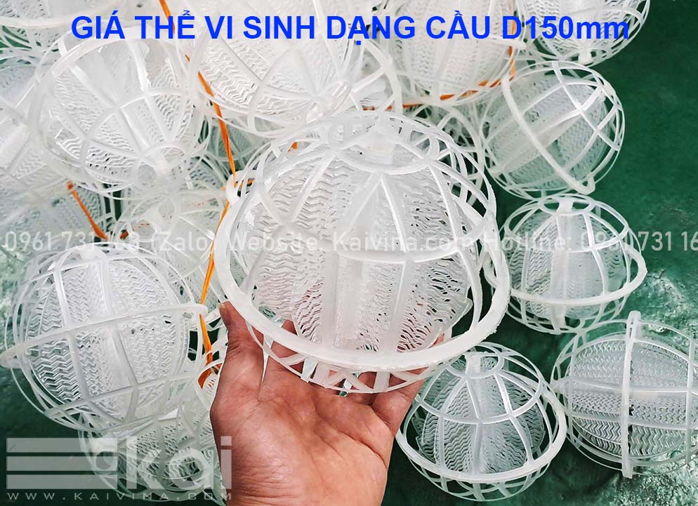 Đệm cầu vi sinh dạng cầu kích thước 150mm hay còn gọi là giá thể vi sinh dạng cầu D150 là vật liệu sinh học dạng cầu được sử dụng rộng rãi trong hệ thống xử lý nước thải. Sản phẩm có cấu trúc hình cầu dạng có nhiều cánh bên trong với đường kính D=150mm, được thiết kế tối ưu để tạo môi trường bám dính và phát triển của vi sinh vật, giúp tăng hiệu quả phân hủy các chất hữu cơ trong nước thải.