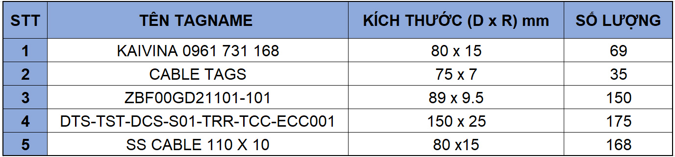 - Thẻ đeo cáp Inox (thẻ treo ký hiệu đánh dấu cáp điện inox) Tagname inox là vật tư được sử dụng phổ biến trên thị trường ví dụ như: năng lượng mặt trời, điện - điện tử, tự động hóa, tàu biển, dầu khí,...Thẻ đeo cáp Inox này giúp cho việc đánh dấu, phân biệt các loại cáp hoặc dây điện có tên gọi dễ dàng.