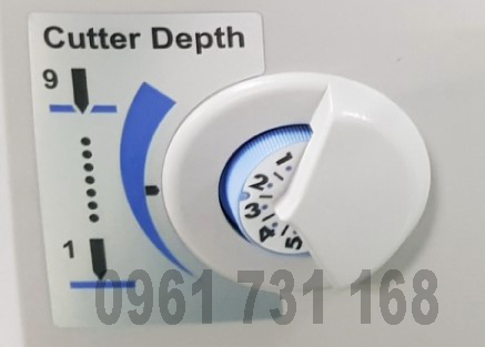 - Nếu thấy dao cắt nhãn sâu quá - ăn xuống cả phần đế của cuộn nhãn thì giảm độ nông - sâu của dao như hình bên trên. Còn nếu dao cắt nhãn mà chưa đứt thì tăng độ nông - sâu lên. Bình thường máy mới để mức độ 3 là vừa.