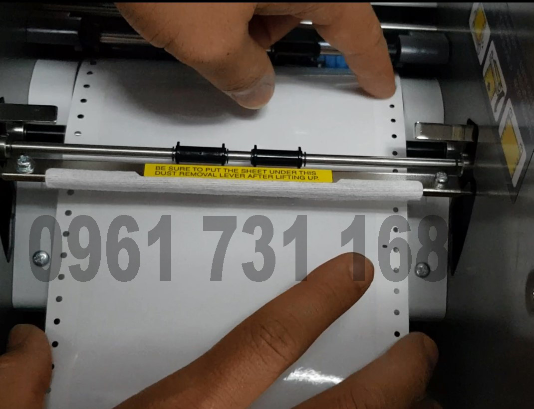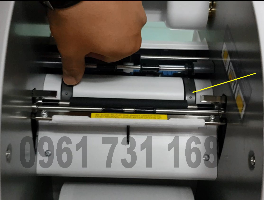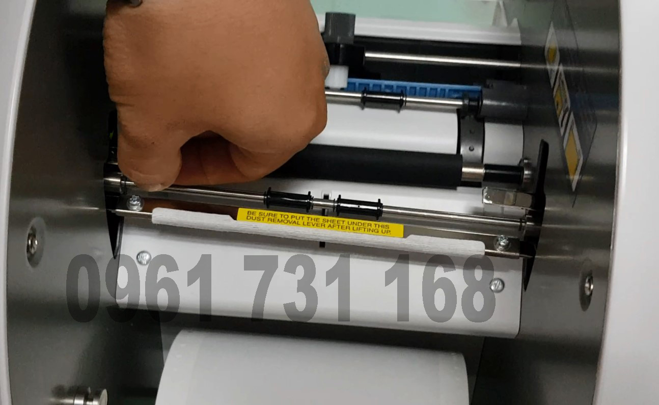 - Đưa đầu cuộn nhãn qua thanh gạt bụi ( thanh chặn nhãn ) và chỉnh 2 hàng lỗ tròn dọc theo cuộn nhãn khớp với dải nhựa kéo cuộn nhãn.