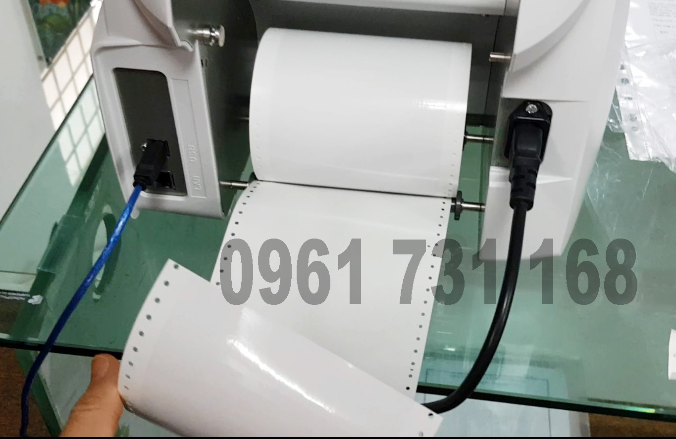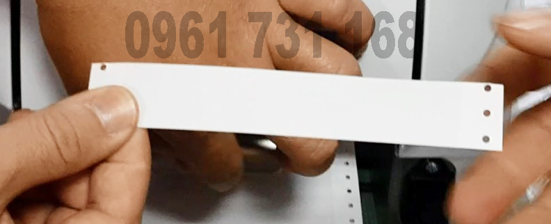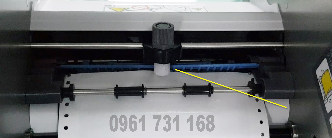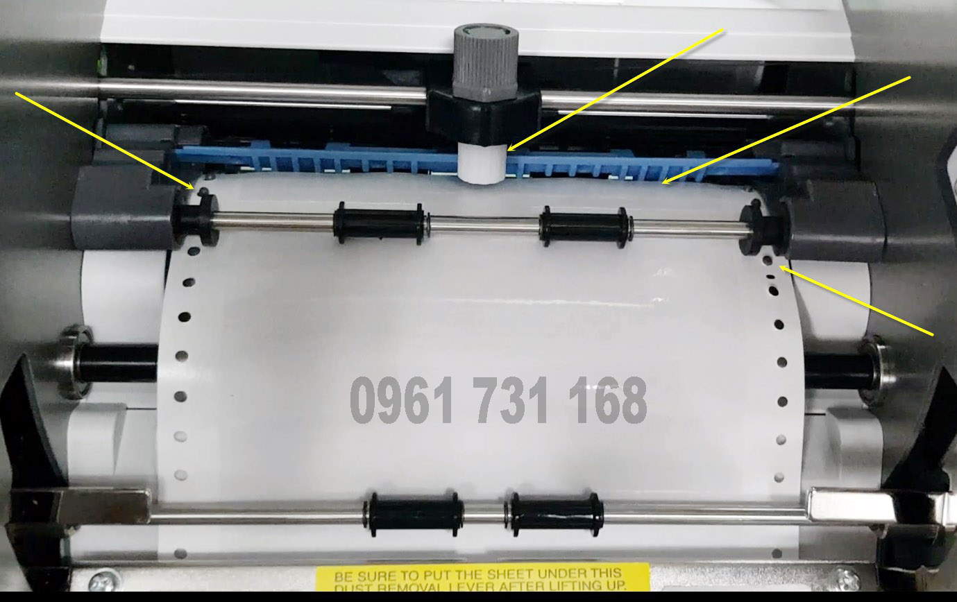 - Đưa đầu cuộn nhãn qua thanh gạt bụi ( thanh chặn nhãn ) và chỉnh 2 hàng lỗ tròn dọc theo cuộn nhãn khớp với dải nhựa kéo cuộn nhãn.