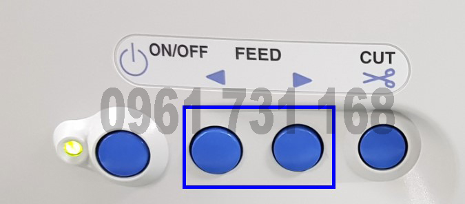 - Kéo nhãn bằng nút tua tiến - lùi qua đầu dao 1 đoạn. Sau đó đóng nắp máy rồi bấm nút CUT, để máy nhận vị trí nhãn đầu tiên của cuộn mới. Phần bị cắt như hình bên dưới: